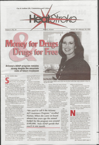 Heatstroke, Vol. 5, Number 60, (February 25- March 10, 1999) Selected article titles: Comic Suzanne Westenhoefer stands up for the Victory Fund; Celebrating victories: national group in Scottsdale for spring conference; Phoenix man targeted for anti-gay crime Blames right-wing legislators for youth's homophobic actions; Making love & making history; Mark Hoffman’s Positive Perspective Helper’s High -